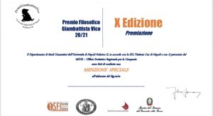 A proposito, invece, dell’interesse con il quale gli studenti si sono accostati alle lezioni la professoressa Romano ha precisato che “I tre partecipanti, di cui due hanno ottenuto la menzione speciale, hanno dovuto seguire delle lezioni con docenti universitari della Federico II e di altre università anche straniere, tutti esperti di Vico e Dante. Le lezioni sono state complesse e hanno richiesto anche un certo tempo di approfondimento e studio. Poi si sono confrontati con noi e abbiamo avuto modo di capire che avevano lavorato molto bene. Proprio perché erano molto interessati hanno profuso tutto questo impegno“. Infine la professoressa ha aggiunto “quando si ottengono dei buoni risultati con gli studenti non è mai merito solo loro o del docente della materia specifica di , ma anche del lavoro di tutto il Consiglio di classe, in particolar anche Del Dipartimento di filosofia che quest’anno ha partecipato a più progetti con ottimi risultati. Di ciò ringrazio tutti i miei colleghi”.
