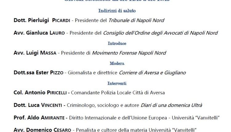 Gli indirizzi di saluto saranno affidati al dott. Pierluigi Picardi – Presidente del Tribunale di Napoli Nord e all’avv. Gianluca Lauro – Presidente del Consiglio dell’Ordine degli Avvocati di Napoli Nord, con l’introduzione dell’Avv. Luigi Massa – Presidente di Movimento Forense Napoli Nord. Modererà l’arch. Ester Pizzo, giornalista e direttore del “Corriere di Aversa e Giugliano”.