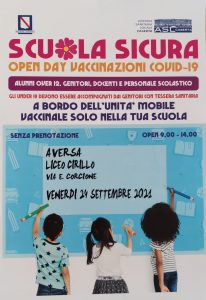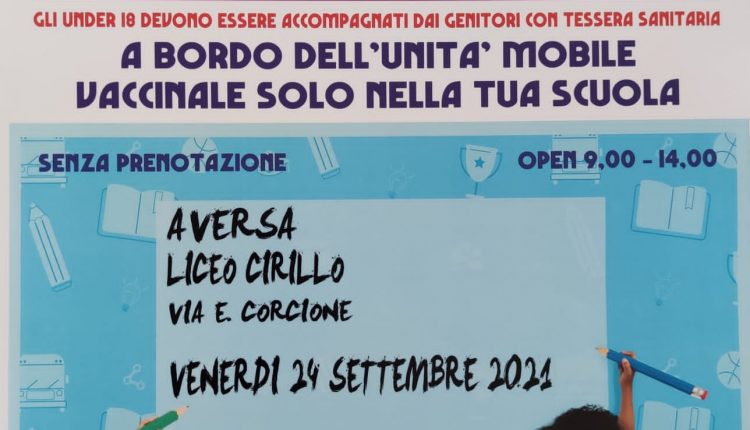 Aversa-Il liceo classico e musicale “D. Cirillo” (DS Luigi Izzo) apre le porte all’unità mobile vaccinale, per offrire la possibilità ad alunni over 12, ai genitori, ai docenti e al personale scolastico di sostenere la battaglia al coronavirus mediante la vaccinazione. Dalle 9 alle 14 di venerdì 24 settembre le suddette categorie potranno accedere agli spazi che saranno appositamente adibiti. Gli alunni under 18 dovranno essere accompagnati dai genitori forniti di tessera sanitaria.