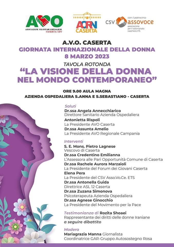 Organizzata in collaborazione con l’AORN di Caserta e con il patrocinio del CSV Asso.Vo.Ce ETS l’iniziativa, promossa da AVO Caserta, si propone di offrire spunti che ci consentano di riflettere sul ruolo della donna di ieri e di oggi.