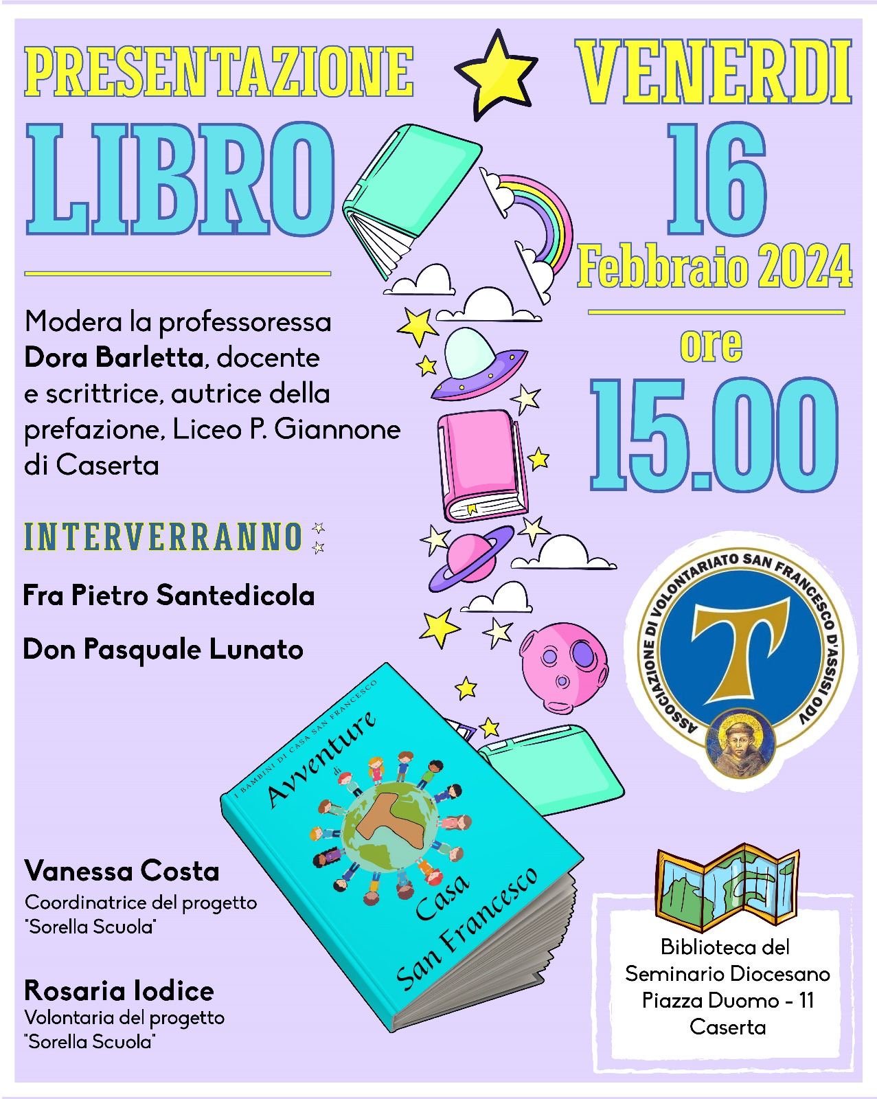 Caserta. Tutto pronto per la presentazione del libro “ Avventure di Casa San Francesco “ che si svolgerà’ Venerdì 16 febbraio 2024 alle ore 15.presso la sede dell’ Associazione Casa di San Francesco sita in Piazza Vanvitelli e di cui e’ Presidente la Dott.ssa Maddalena Russo.