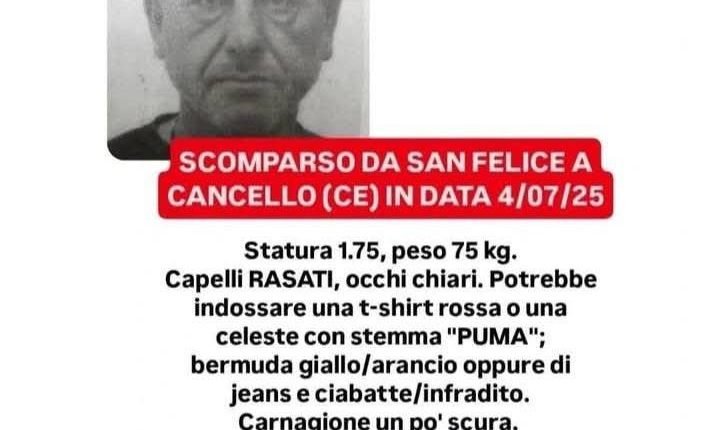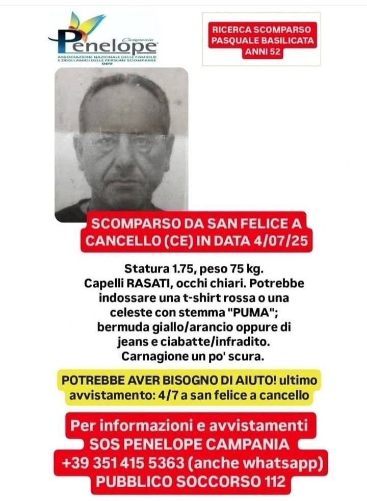Secondo informazioni giunte sulla pagina ufficiale dell’associaizone Penelope Campania, che si occupa di ritrovare persone scomparse, Pasquale Basilicata, allontanatosi dalla sua dimora di San Felice a Cancello una settimana fa, il 4 luglio, sarebbe stato avvistato tra Caserta e la Caritas di Casagiove dove avrebbe pranzato.