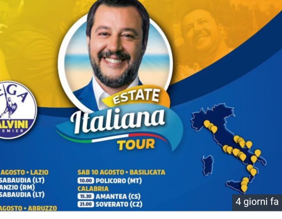Cellole (CE) Matteo Salvini sarà il 15 agosto a Baia Domizia; arriverà a Castelvolturno alle ore 11:00 per essere presente al Comitato provinciale per l’ ordine e la sicurezza. Alle 12.30 si porterà sul lungomare di Castelvolturno presso il Lido Fontana blue del Villaggio Coppola. Nella serata, intorno alle 20.30 terrà un comizio pubblico in Baia Domizia, presso l’ area parcheggio.