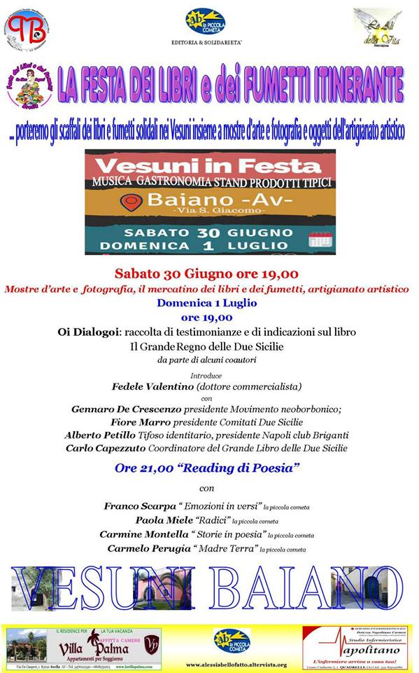 La festa dei libri e dei fumetti di Avella , si fa itinerante e sarà presente sabato 30 giugno e domenica 1 luglio a Baiano nella kermesse gastronomica popolare “Vesuni in Festa” promossa dall’associazione Perbacco fondata da Stefano Lieto.