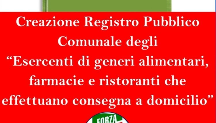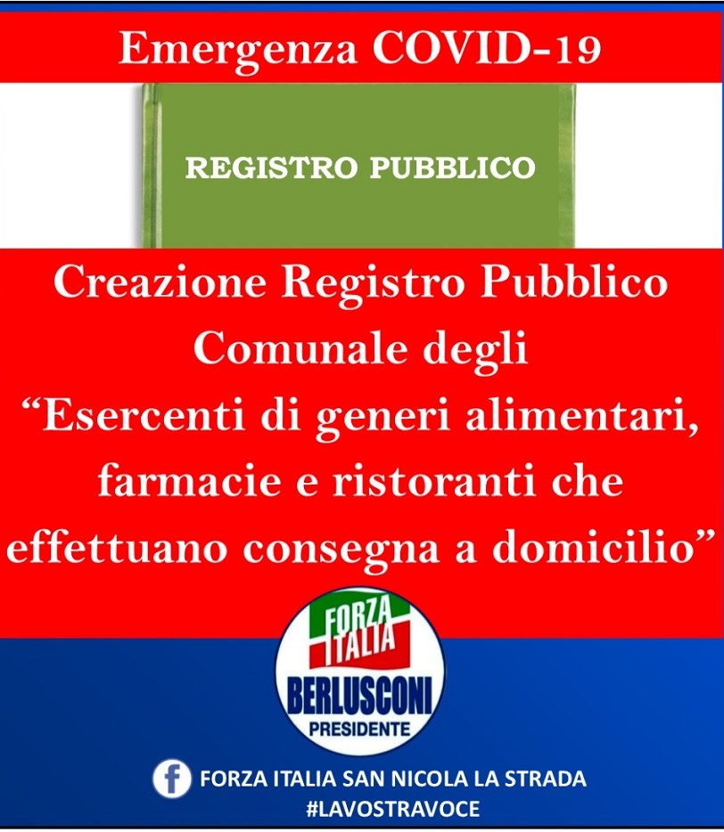 Il coordinamento cittadino di San Nicola la Strada di Forza Italia, su proposta del responsabile alla Trasparenza e rapporti con la Pubblica Amministrazione, Dott. Corrado MANDATI, nel segno della collaborazione tra tutte le forze civiche e politiche nella lotta alla diffusione del COVID-19, propone a codesta amministrazione, di valutare eventuale attivazione di un pubblico registro, presso gli uffici dell’amministrazione comunale (Protezione Civile) con l’indicazione degli esercenti di generi alimentari, farmacie e ristoranti che hanno attivato il servizio di consegna a domicilio, invitando gli stessi a comunicare il nome ed il numero telefonico o l’email.