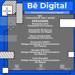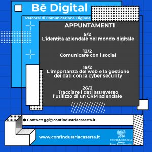 Organizzato in 4 webinar online (ciascuno della durata di 45 minuti) ogni venerdì del mese di febbraio alle ore 17, il percorso “BE DIGITAL” ha preso il via lo scorso 5 febbraio affrontando il tema dell’identità aziendale nel mondo digitale. In quell’occasione sono intervenuti i Presidenti dei Giovani Imprenditori e della Piccola Industria di Confindustria Caserta, il titolare dell’azienda di comunicazione digitale Alphadelta e il CEO e co-founder di 012 Factory, InnovationHub, incubatore per start-up riconosciuto dal Ministero dello Sviluppo Economico, centro di riferimento in Italia.