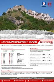 e vetture d’epoca Centoporte (anni ’30) e Corbellini (anni ’50), che poi proseguirà la corsa per Pietrelcina, dove è prevista una solenne cerimonia in occasione del cinquantennale del beato transito di Padre Pio, Morcone (in concomitanza con la Fiera) e Santa Croce del Sannio, dove sarà inaugurata l’ultima fermata della linea storica beneventana alla presenza anche di Luigi Cantamessa e Mauro Moretti, direttore e presidente Fondazione FS. L’iniziativa rientra nelle attività promosse da Regione Campania e Fondazione FS Italiane che, con il sostegno del Ministero dei Beni e delle Attività Culturali e del Turismo, ha trasformato circa 400 km di linee ferroviarie, ormai prive di trasporto pubblico, in un suggestivo museo dinamico. Obiettivo congiunto del progetto – che prende il via dal Protocollo di intesa siglato da Regione Campania, MIBACT, Rete Ferroviaria Italiana e Fondazione FS Italiane per la riattivazione della linea storica – è valorizzare un patrimonio per lo più sconosciuto al turismo di massa ed integrare le proposte culturali, religiose, enogastronomiche ed artistiche dei territori sanniti coinvolti. “Abbiamo rispettato il cronoprogramma insieme ad RFI e a Fondazione FS – spiega Costantino Boffa, delegato per l’attuazione della linea ferroviaria storica e già consigliere del presidente De Luca per la realizzazione della ferrovia Napoli-Bari e per i progetti di sviluppo connessi – ed ora stiamo mettendo in rete i Comuni interessati. Le amministrazioni stanno collaborando attivamente per creare una offerta turistica integrata e valorizzare le proprie eccellenze territoriali ma nell’ambito di un progetto unitario. Adesso, dopo aver completato i 50km della linea storica che porta in Molise, abbiamo l’infrastruttura ma dobbiamo ristrutturare le stazioni ed i caselli che diventeranno spazi espositivi per promuovere le risorse locali”. I treni storici per Benevento, con partenza da Salerno e da Napoli, sono già programmati in coincidenza degli orari dell’alta velocità. Un modo per consentire ai turisti di raggiungere facilmente e rapidamente i territori attraversati dal treno storico e poi fruirli lentamente. E non solo. Per il 2019, si definirà un programma di sviluppo per trasformare le vecchie stazioni in B&B e creare pacchetti per il fine settimana con una offerta territoriale integrata, in grado di mettere insieme turismo religioso, visita dei beni culturali e dei siti Unesco, principali eventi locali e rete dei cammini storici, come il Regio Tratturo che costeggia i Comuni del Tammaro attraversati dal treno e giunge in Molise ed in Puglia. Si punta, dunque, soprattutto a coinvolgere associazioni del territorio e a mettere in connessione la linea storica sannita con le altre già attive in Abruzzo e Basilicata, incrociando a nord il treno storico della linea Roccaraso-Sulmona-Carpinone, e a sud la linea Rocchetta-Sant’Antonio. La manifestazione in programma il 23 settembre 2018 a Benevento è promossa da Regione Campania e Fondazione FS, in collaborazione con Confederazione Nazionale Artigianato “Campania Nord” e Sannio Autentico, che promuove sin dall’inizio il progetto turistico collegato al treno storico Sannio Express, supportando i Comuni ed i territori sanniti nell’organizzazione delle attività, nelle inaugurazioni delle stazioni e negli aspetti logistici, e presentando il treno storico nelle principali borse del turismo. Proprio Sannio Autentico nel 2019 si occuperà di mettere in rete i territori con i privati, organizzando pacchetti turistici, educational tour e servizi di accoglienza, e prevedendo un calendario integrato di eventi ed azioni mirate di marketing e comunicazione. I biglietti per viaggiare sul treno storico Sannio Express, in partenza domenica da Salerno alle ore 9.15 (con fermate anche a Mercato San Severino ed Avellino), saranno in vendita, fino al giorno dell’evento, in biglietterie e self service di stazione, agenzie di viaggio abilitate, sul sito trenitalia.com e su app trenitalia. Sarà possibile acquistarli anche a bordo treno, senza alcuna maggiorazione di prezzo, ed in base alla disponibilità dei posti a sedere. Il programma di domenica è particolarmente ricco e prevede eventi, mostre, inaugurazioni, convegni e degustazioni a bordo del treno storico con prodotti tipici.