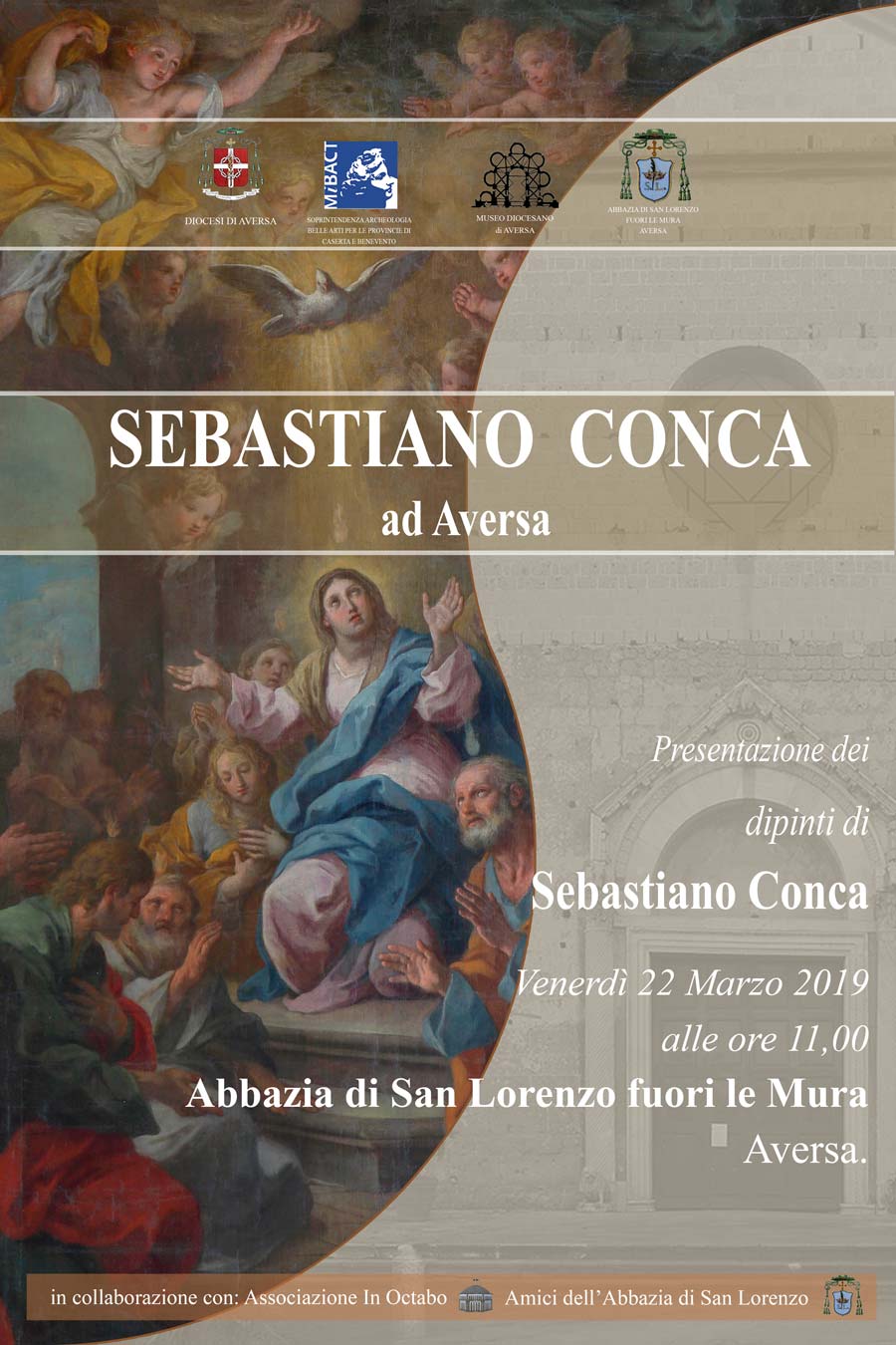 Venerdì 22 marzo alle 11, presso il complesso abbaziale di San Lorenzo fuori le mura di Aversa, avrà luogo la presentazione dei dipinti di Sebastiano Conca, restituiti dalla Soprintendenza Archeologia, Belle Arti e Paesaggio per le province di Caserta e Benevento, alla chiesa abbaziale di San Lorenzo, per la quale il pittore gaetano le eseguì nel 1761.