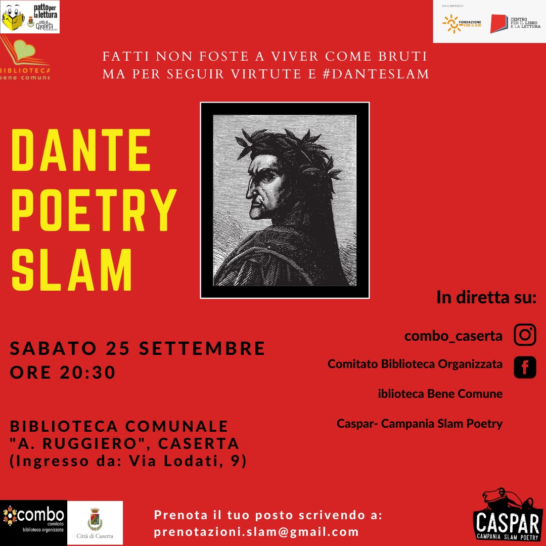 Sabato 25 settembre alle ore 20.30 si terrà il Dante Poetry Slam presso la Biblioteca Comunale “A.Ruggiero” di Caserta, il cui ingresso è situato presso Via Lodati, 9.