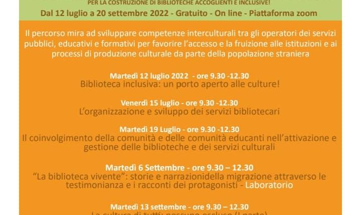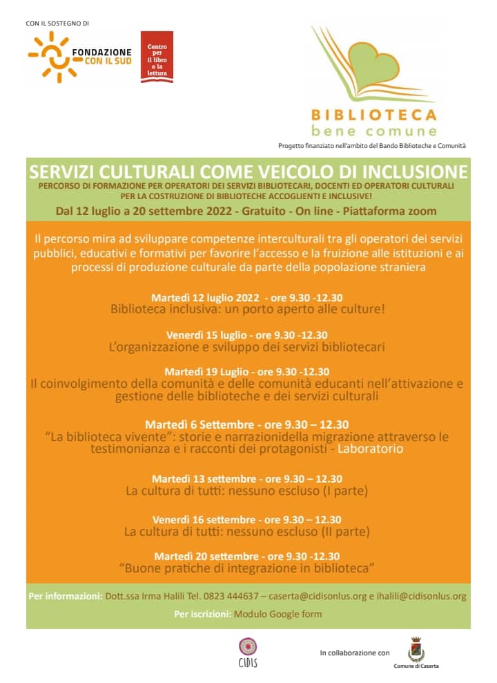 Caserta- Sta per partire il Percorso di formazione per operatori culturali, addetti ai servizi bibliotecari, mediatori, educatori e docenti della scuola dell’infanzia, primaria e secondaria per la costruzione di Biblioteche accoglienti e inclusive. Si tratta di una iniziativa di Cidis onlus realizzata nell’ambito del progetto Biblioteca Bene Comune – sostenuto da Fondazione con il Sud e Centro per il Libro e la Lettura – in collaborazione con il Comune di Caserta. Sette incontri – sei on line e uno in presenza – tutti gratuiti, in programma dal 12 luglio al 20 settembre, per sviluppare le competenze interculturali degli operatori impegnati nei servizi pubblici, educativi e formativi e favorire così l’accesso della popolazione straniera alle istituzioni e garantire loro la fruizione dei processi di produzione culturale. Il fine ultimo è infatti quello di migliorare l’inclusione sociale dei migranti. Nel dettaglio verrà dato infatti ampio spazio alla condivisione di buone pratiche e modelli già sperimentati con successo in altri territori oltre naturalmente alle soluzioni tecnologiche facilitanti e alle modalità di accesso alle opportunità indispensabili per sostenere attività future. Il percorso di formazione e aggiornamento si svolgerà on line su piattaforma zoom. In calendario sei incontri, ciascuno della durata di tre ore, in programma ogni martedì e venerdì dalle 9,30 alle 12,30 e un laboratorio – anch’esso della durata di tre ore – che si terrà in presenza nella sala espositiva della Biblioteca comunale ‘Ruggiero’ di via Laviano a Caserta. Tra gli argomenti che verranno affrontati ci sono l’organizzazione e lo sviluppo dei servizi bibliotecari, il coinvolgimento delle comunità nella gestione delle biblioteche, l’accoglienza dei cittadini stranieri in biblioteca attraverso l’ampliamento del patrimonio librario da arricchire con volumi in lingua, il progetto ‘Biblioteca vivente’ che prevede storie e narrazioni della migrazione attraverso le testimonianze e i racconti dei protagonisti. Al termine del corso verrà rilasciato un attestato di partecipazione.