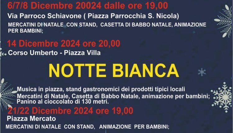 L’amministrazione comunale insieme alla Proloco presieduta da Luigi Corvino e tutte le associazioni partecipanti del territorio hanno organizzato il calendario degli eventi natalizi che inizieranno il 6 dicembre.