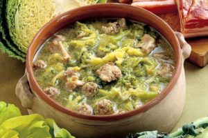 g 200 cicoria – g 200 scarola – g 200 verza – g 200 borragine – g 200 catalogna – 4 costine di maiale – g 400 polpa di maiale – g 100 cacio fresco – g 50 guanciale – g 50 lardo – 1 spicchio d’aglio – rosmarino – salvia – sale – pepe