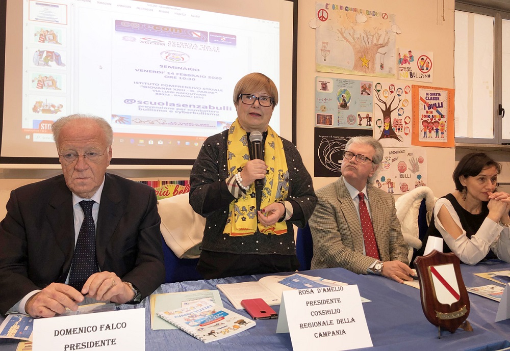 BAIANO (AV) – “L’ascesa dei fenomeni di bullismo e cyberbullismo in Italia e in Campania è allarmante. Noi denunciamo da tempo questa situazione e con il Corecom stiamo intensificando la campagna capillare in tutte le scuole della nostra regione. Stiamo incontrando migliaia di studenti, bisogna informarli sui rischi che corrono sul web e nell’utilizzo delle nuove tecnologie. Un lavoro serio che va fatto sul terreno della prevenzione che deve coinvolgere anche i genitori”. Queste le parole di Rosa D’Amelio, presidente del Consiglio regionale della Campania, che ha partecipato alla terza tappa della campagna “@scuolasenzabulli” per la prevenzione dei fenomeni del bullismo e del cyberbullismo, organizzata dal Corecom Campania, presieduto da Domenico Falco, che si è svolto all’istituto “Giovanni XXIII – G. Parini” di Baiano.