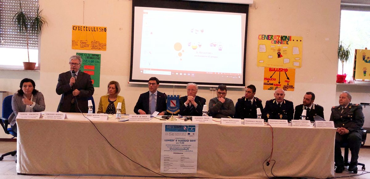 “Lavoriamo ad un patto tra istituzioni, scuola e famiglie per aiutare i ragazzi a denunciare i fenomeni di bullismo e di cyberbullismo di cui sono vittime o dei quali vengono a conoscenza. Il nostro obiettivo è far diventare gli studenti della Campania vere e proprie ‘sentinelle di legalità’ per dire ‘No alla violenza’, ai soprusi e alle molestie che subiscono dentro e fuori la scuola”. È quanto ha affermato, martedì 6 maggio 2019, Domenico FALCO, presidente del Corecom Campania, nel corso della settima tappa della campagna #scuolasenzabulli, organizzata dal Comitato Regionale per le Comunicazioni della Campania nell’aula magna dell’istituto scolastico “Giovanni XXIII” di Baiano.