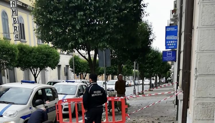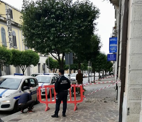 Piovono invece calcinacci dall’edificio che ospita il locale comando di Polizia Municipale in corso I Ottobre. L’area interessata dalla caduta è stata già transennata.