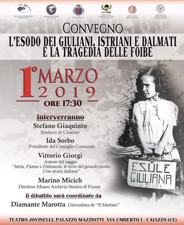 CAIAZZO – Venerdì 1 marzo 2019, con inizio alle ore 17.30, presso il piccolo Teatro Jovinelli di Caiazzo, si terrà un convegno promosso dall’Amministrazione comunale dal titolo “L’esodo dei giuliani, istriani e dalmati e la tragedia delle Foibe” in collaborazione con Ass. Storica del Caiatino, Ass. fotografica “E. Puorto”, Pro Loco Caiazzo “N. Marcuccio”, Ass. Combattenti e Reduci – Sez. Caiazzo e Ass. Unione Regioni Storiche Europee, con l’obiettivo di conservare e rinnovare la memoria della tragedia degli italiani e di tutte le vittime delle foibe, dell’esodo dalle loro terre degli istriani, fiumani e dalmati durante il secondo conflitto mondiale.