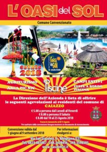. Per info e prenotazioni si può chiamare ai numeri 0823/865007 – 348/3428454 – 349/3598585. Se si preferisce il web www.oasidelsol.it e la pagina Fb Oasi del Sol. “Un accordo per consentire ai caiatini di godersi, a pochi chilometri di distanza, un giorno di divertimento e spensieratezza, tra l’altro in un luogo immerso nel verde e nella natura. Una opportunità soprattutto per famiglie in difficoltà ed economicamente alle prese con redditi ridotti, un’occasione per trascorrere una giornata in piscina lontani da quotidianità e problemi. Per usufruire della riduzione – spiega il sindaco di Caiazzo Stefano Giaquinto – basterà esibire un documento di riconoscimento così da mostrare la propria residenza”.