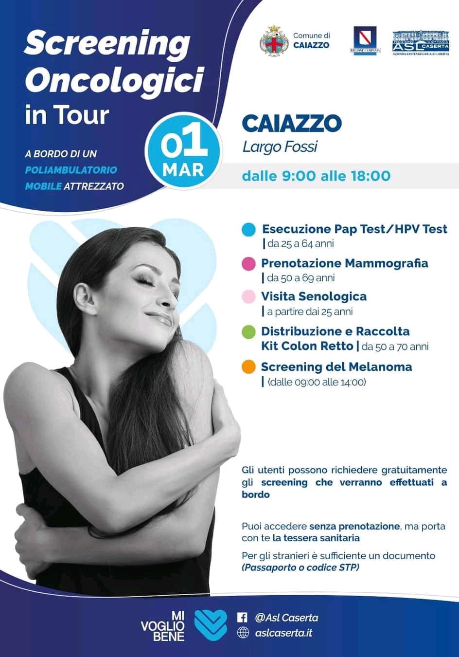 Caiazzo. Promossa dall’ASL Caserta per la giornata di domani, martedì 1 marzo, la campagna di prevenzione “Mi voglio bene” – Screening oncologici in tour, alla quale l’amministrazione comunale ha aderito con apposita delibera di Giunta. Appuntamento in Largo Fossi, dalle 9:00 alle ore 18:00, dove sarà presente il camper dell’ASL per poter richiedere gratuitamente gli screening. Si può accedere senza prenotazione, con la tessera sanitaria. Per i cittadini stranieri è sufficiente un documento di riconoscimento. “Si ringrazia l’ASL Caserta per questa iniziativa e invitiamo la cittadinanza a partecipare”. Così il Sindaco e l’amministrazione comunale in occasione di una giornata che vuole fare della prevenzione il migliore strumento di cura.