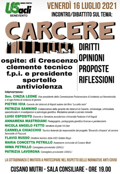 Cusano Mutri. La questione carcere è oggi di grande attualità, visti anche i recenti fatti di cronaca. Per questo motivo, ma non solo, la US ACLI di Benevento, insieme a Calatia Rosa, ha organizzato per venerdì 16 luglio alle ore 19.00 un incontro/dibattito nella sala consiliare del comune di Cusano Mutri (BN) in cui si parlerà dei diritti dei detenuti.