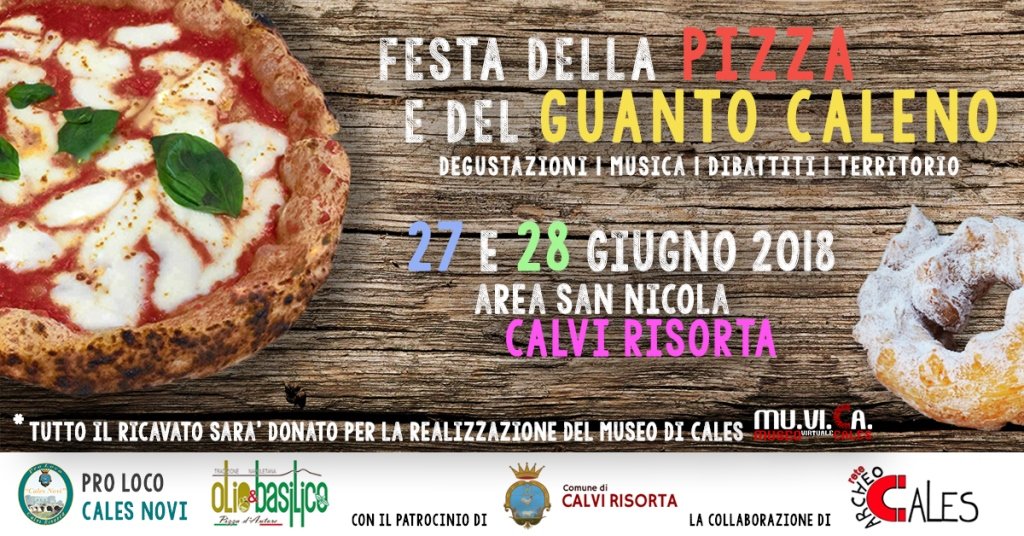 CALVI RISORTA – Il 27 ed il 28 giugno 2018 la Pro Loco Cales Novi e la Pizzeria Olio e Basilico di Calvi Risorta, in collaborazione con i volontari Rete ARCHEOCALES e con il patrocinio del Comune di Calvi Risorta, hanno il piacere di invitarvi alla manifestazione gastronomica dei prodotti tipici del nostro territorio, la “Pizza” e l’inimitabile dolce: “Il Guanto Caleno”. La prima, infornata e lavorata dalle mani dei pizzaioli della Pizzeria Olio e Basilico