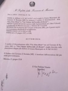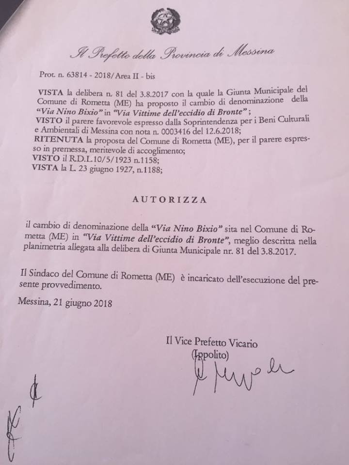Il 21 giugno scorso, il sindaco di Rometta (ME), Avv. Nicola Merlino , ha autorizzato il cambio della denominazione, della via Bixio, in Via Vittime dell’ eccidio di Bronte.
