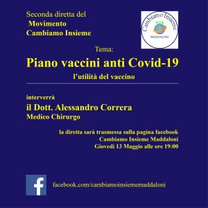 Il Movimento politico “Cambiamo Insieme”, guidato dal Vicesindaco di Maddaloni Luigi Bove e dal Consigliere Salvatore De Rosa, presenta ufficialmente la sua seconda diretta Facebook. In questo appuntamento, previsto per giovedì 13 Maggio alle ore 19:00, si parlerà del dibattuto quanto attuale tema del Piano Vaccinale Anti Covid-19. Ospite della diretta il Medico Chirurgo Alessandro Correra che risponderà ad alcune domande sull’argomento della campagna vaccinale locale ma anche nazionale. Ad intervistare l’ospite saranno Anna Schioppa e Fiorella Tagliafierro, due attiviste del Movimento. Per seguire la diretta sarà sufficiente collegarsi, giovedì sera alle 19:00, sulla pagina Facebook di “Cambiamo Insieme-Patto per Maddaloni”.