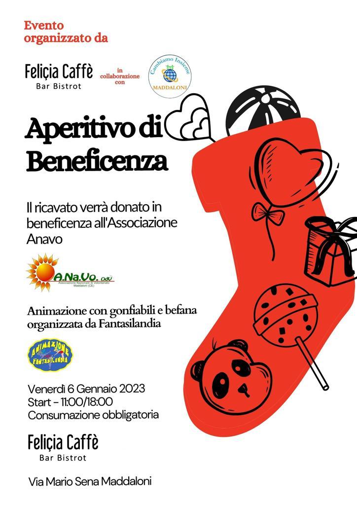 Maddaloni . Il Movimento Civico Cambiamo Insieme di Maddaloni organizza la Befana Solidale in favore dei bambini assistiti dall’associazione Anavo di Maddaloni. L’evento si terrà Venerdì 6 Gennaio dalle ore 11.00 alle ore 18.00 presso il Bar Bistrot Felicia di via Mario Sena. L’ evento e’ organizzato ed ideato dal Bar in concerto con il Movimento Civico Cambiamo Insieme . Il ricavato della giornata e quindi delle consumazioni effettuate al Bar sarà devoluto per i bambini assistiti dall’ associazione Anavo di Maddaloni . Ci saranno animazioni e la rappresentazione della Befana a cura di Fantasilandia.