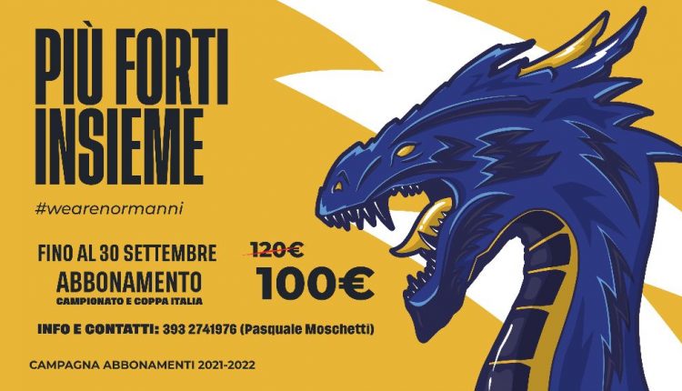 Più forti, insieme!”. Questo il ‘claim’ utilizzato dalla Ismea Aversa per lanciare la campagna abbonamenti per la stagione 2021-22. Un ‘ticket’ annuale che tutti i tifosi normanni potranno acquistare al PalaJacazzi o chiedendo informazioni ai dirigenti del club (il riferimento è il club manager Pasquale Moschetti, al 393 274 1976). Un prezzo pressoché simbolico visto che per tutte le gare di campionato e per tutte le partite di Coppa Italia la società del presidente Sergio Di Meo ha previsto il prezzo (in prevendita) di 100 euro. Da ottobre in poi invece ci sarà un ‘aumento’ di 20 euro e il totale sarà di 120 euro. E’ importante per tutti coloro che vorranno seguire le gesta di Michele Morelli e compagni acquistare il prima possibile il prezioso abbonamento: saranno garantiti solamente 300 tagliandi data anche la capienza ridotta della struttura di via Salvo d’Acquisto. Il Covid sta, purtroppo, negando a tutti noi di riempire il palazzetto e quindi l’abbonamento potrà garantire l’accesso all’impianto per tutti i match della formazione guidata da coach Giacomo Tomasello. La dirigenza ha voluto, grazie anche ad un videoclip pubblicato sulla pagina facebook della società (https://www.facebook.com/NormannaAversaAcademy/videos/416862856465716/), legare il nome della Ismea Aversa alla splendida città normanna: il drone ‘racconta’ le eccellenze della terra, con quel legame tra città e pallavolo che non è mai mancato nel corso degli ultimi decenni. Aversa si prepara, ancora una volta, a rappresentare una parte di Sud in tutta l’Italia e soprattutto si prepara ad ospitare quella Serie A che bisogna difendere con gli artigli. Serve il sostegno di tutti, abboniamoci e vinciamo. Perché “insieme siamo più forti”.