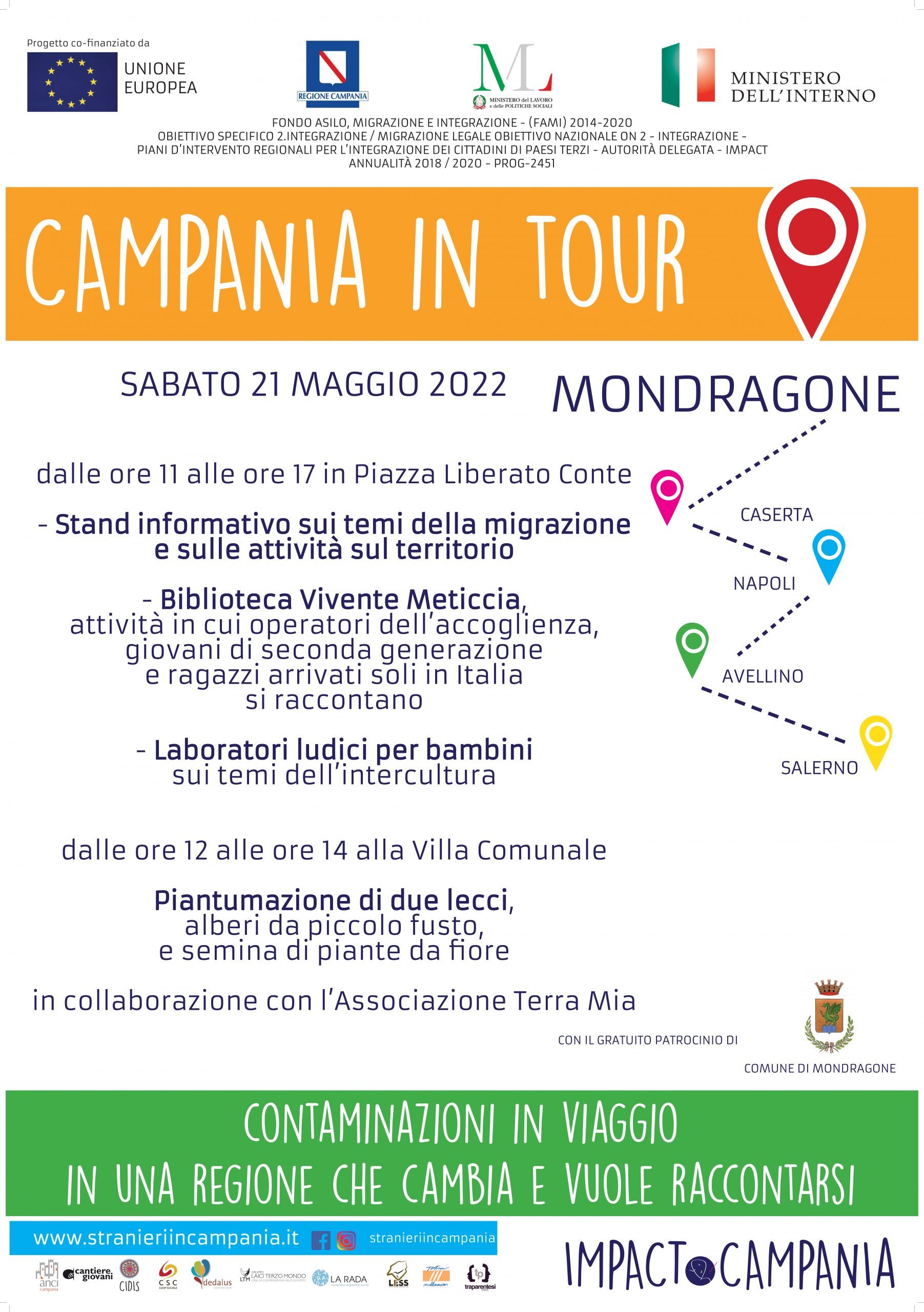 Dopo il successo della prima tappa di Caserta, sabato 21 maggio, il Campania in Tour arriva a Mondragone, per un evento organizzato da Cidis nell’ambito del progetto Impact Campania con il patrocinio gratuito del Comune di Mondragone. A partire dalle ore 11:00 fino alle ore 17:00, Piazza Liberato Conte ospiterà una serie di iniziative all’insegna del divertimento e della cultura, ma anche dell’informazione con un infopoint dedicati ai temi delle migrazioni, dell’associazionismo migrante e dell’accoglienza in famiglia.