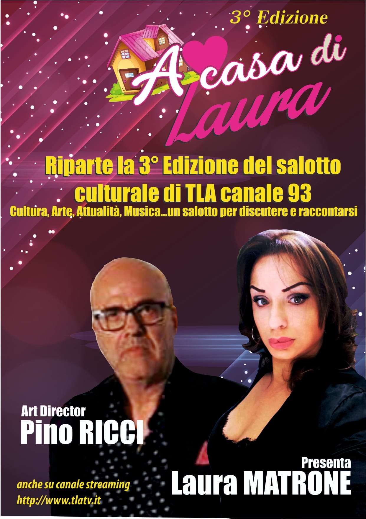 È da poco iniziata la terza edizione del programma televisivo “A casa di Laura”, ideato da Pino Ricci e condotto da Laura Matrone. Il talk show in onda il sabato sera su Tla dalle ore 20.00, affronta tanti temi che vanno dalla politica, alla cultura, fino all’attualità. Anche in questa nuova stagione nel salotto televisivo di Laura, che raccoglie una fetta di pubblico molto eterogeneo, si alterneranno ospiti qualificati capaci di dare consigli utili ai telespettatori sulle più disparate tematiche.