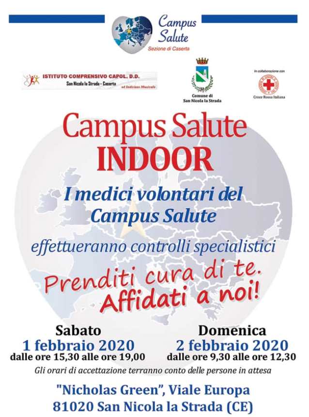 SAN NICOLA LA STRADA – Torna il “Campus Salute Indoor”, la campagna di prevenzione rivolta alla cittadinanza promossa dalla sezione di Caserta dell’Associazione Campus Salute Onlus, presieduta dal dottor Rosario CUOMO. La prima tappa dell’edizione 2020 avrà luogo il primo fine settimana di febbraio a San Nicola la Strada.