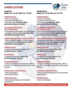 Il primo appuntamento è dunque fissato per sabato 1 febbraio 2020 dalle ore 15:30 alle ore 19:00 e domenica mattina 02 febbraio dalle ore 9:00 alle ore 12:30 presso I.C. Plesso Nicholas Green in viale Europa 13, a San Nicola la Strada. Medici volontari effettueranno controlli specialistici, visite e screening gratuiti per permettere la prevenzione primaria delle malattie intervenendo nella fase più precoce.