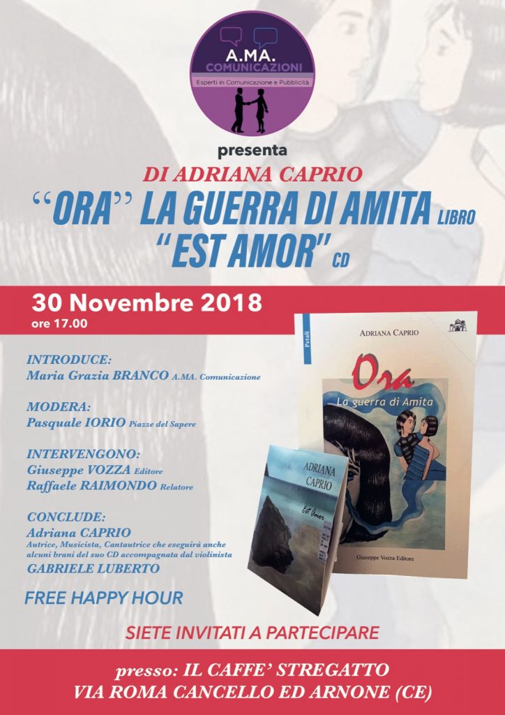 L’ Artista casertana Adriana Caprio presentera’  venerdi’ 30 Novembre 2018 ore 17,00  il libro  “ORA” LA GUERRA DI AMITA , secondo volume della saga ” ORA: LA LEGGENDA DELLE QUATTRO GUERRIERE TERRESTRI”  e il CD ” EST AMOR “.