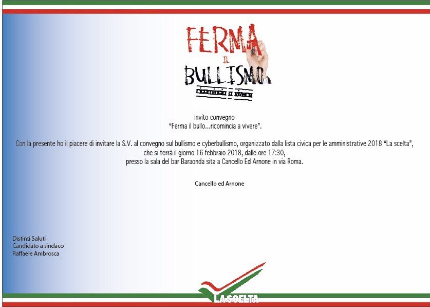 CANCELLO ED ARNONE. LISTA CIVICA ” LA SCELTA ” : CONVEGNO SUL BULLISMO Condividi FacebookTwitterWhatsAppTelegramE-mailStampa