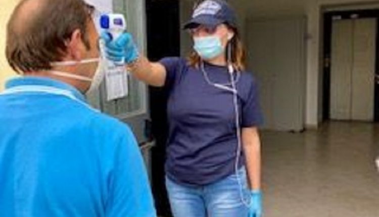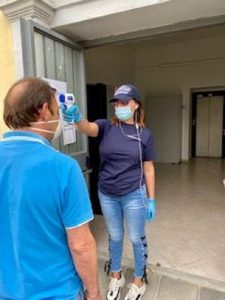 I volontari di Protezione Civile, misurano, velocemente, la temperatura di tutti coloro che fanno il proprio ingresso presso la Casa Comunale in modo da segnalare eventuali stati febbrili.