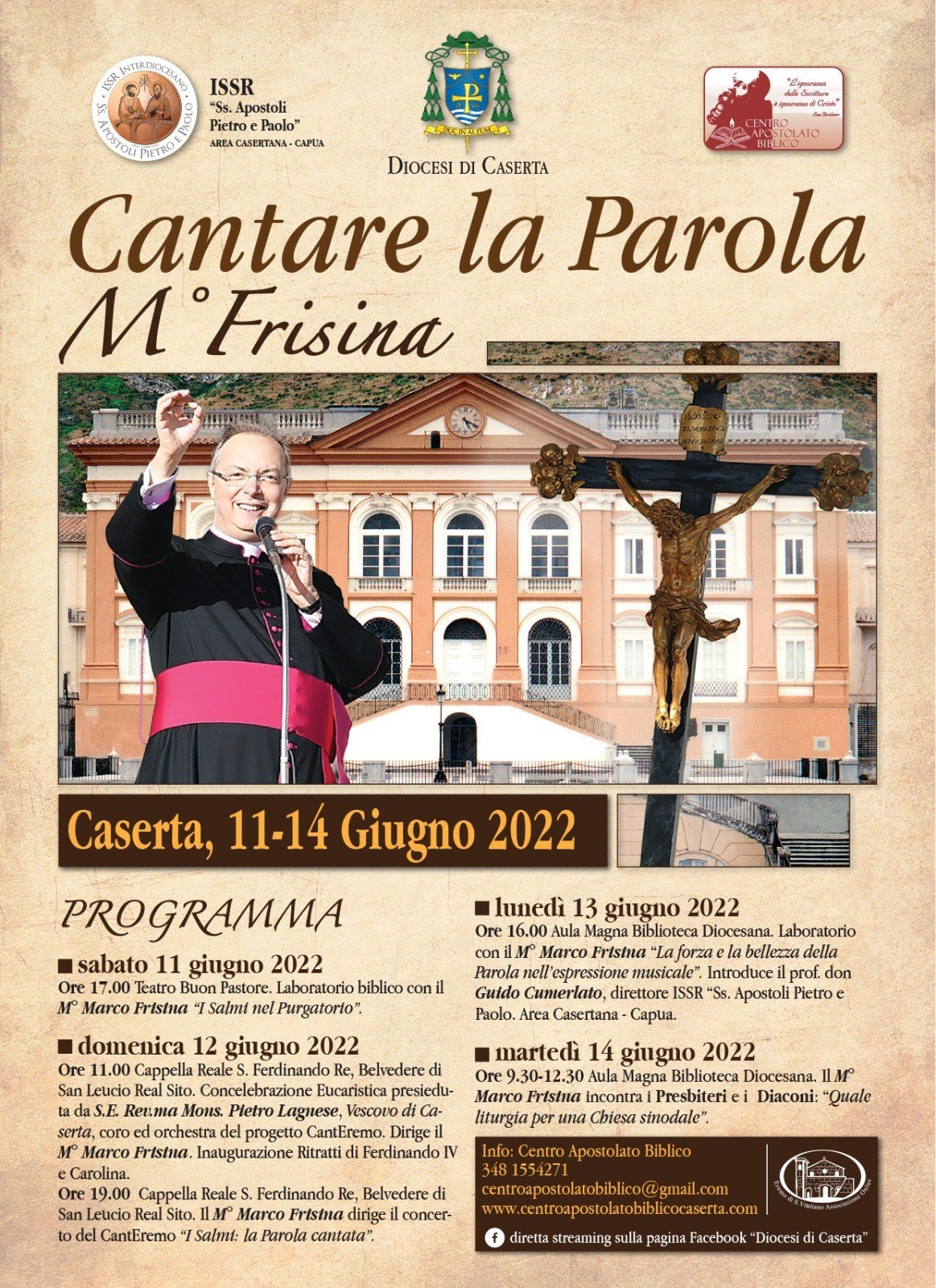 Il Centro Apostolato Biblico e l’Ufficio per l’Educazione, la Scuola e l’Università della Diocesi di Caserta diretti da don Valentino Picazio, in collaborazione con l’ISSR “SS. Apostoli Pietro e Paolo Area Casertana” – Capua, volendo proporre alcuni momenti di formazione sui Salmi nel Purgatorio di Dante e sulla sinodalità della Chiesa, organizzano una serie di laboratori con Mons. Marco Frisina, biblista e noto compositore. L’iniziativa, dal titolo “Cantare la Parola”, ha trovato posto all’interno della Settimana della Bellezza, condividendone così il tema proposto. Mons. Frisina sarà a Caserta da sabato 11 a martedì 14 giugno.