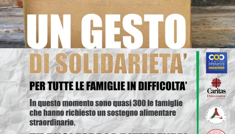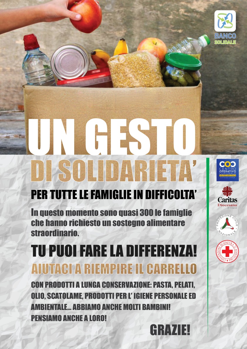 E la seconda iniziativa di oggi proveniente dal COC di Capua, in cui confluiscono la Protezione Civile, la Croce Rossa Italiana, la Caritas, in collaborazione con il Banco Solidale è stata ribattezzata “Aiutaci a riempire il carrello”. “Grazie al COC , dice il sindaco Luca Branco – è stata lanciata anche questa iniziativa, che mira a riempire i carrelli con prodotti a lunga conservazione quali pasta, pelati, olio, scatolame, prodotti per l’igiene personale ed ambientale.