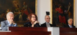 CAPUA (Raffaele Raimondo) – Giorgio Agnisola e Nicola Melone gli eccellenti relatori del Convegno che, con folta partecipazione di pubblico, si è svolto domenica 1° dicembre al Museo Campano. “Il Senso dell’Arte” e “La Bellezza della Matematica” gli affascinanti temi rispettivamente argomentati dai ben noti studiosi. Due piste preziosissime, dunque, ad introdurre la presentazione dell’opera prima, fresca di stampa per le edizioni Eracle, della poetessa-pittrice sammaritana Floriana Viggiano che ha così intitolato l’elegante volume: “Le parole che vado cercando”. In sala, a mo’ di dorata cornice, alcuni selezionati dipinti dell’autrice che hanno attratto ulteriormente lo sguardo degli ospiti. A condurre la sequenza degli interventi la brava giornalista Lidia Luberto. Entusiasti i saluti introduttivi del sindaco Luca Branco – che con vibrante passione ha illustrato la vocazione di Capua Città Madre/Città d’Arte – e dello scrittore e direttore del Museo, Gianni Solino – il quale ha evidenziato il valore formativo della struttura storico-culturale affidata alla sua guida –.