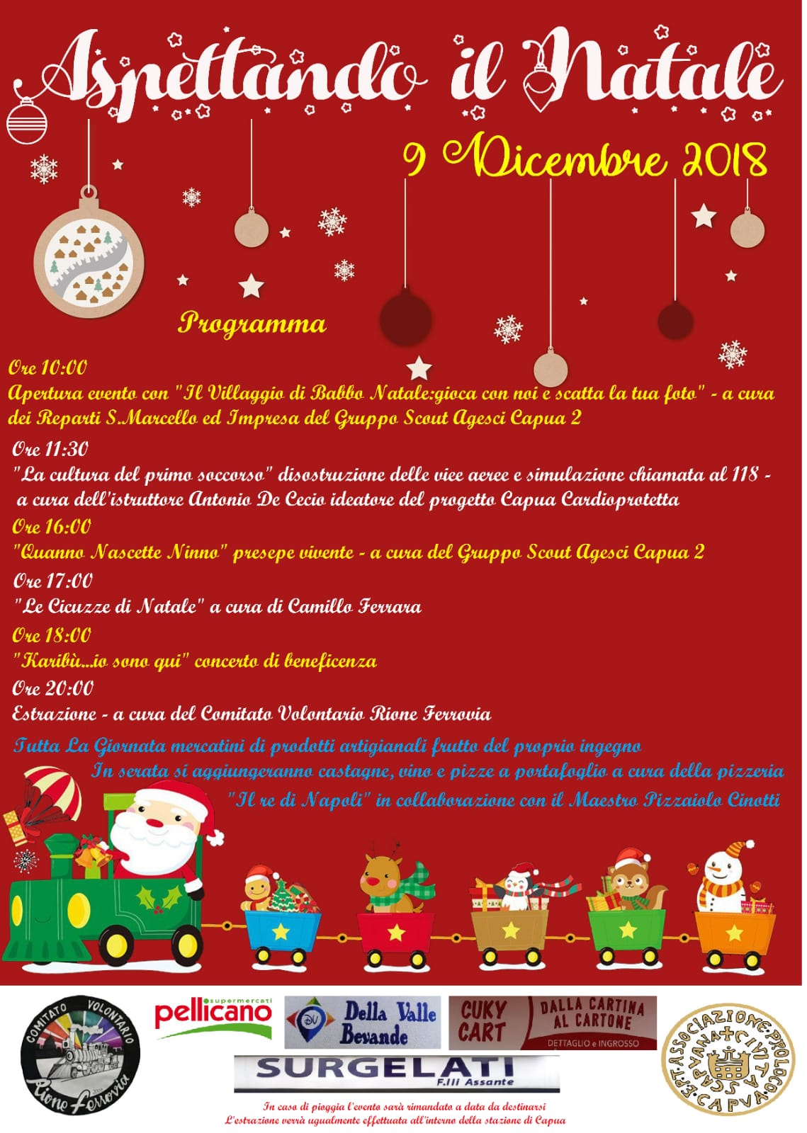 Sapori, odori, colori e atmosfere tipiche del Natale ma anche musiche, canti natalizi per arrivare da Babbo Natale che qui ha scelto la sua nuova sede. Il programma prevede alle ore 10.00 l’apertura del “Villaggio di Babbo Natale” a cura dei Reparti San Marcello e Impeesa del Gruppo Scout Capua 2; alle 11.30 “La cultura del primo soccorso”, a cura dell’istruttore Antonio De Cecio; alle ore 16.00 “Quanno nascette Ninno”, presepe vivente, a cura del Gruppo Scout Agesci Capua 2; alle ore 17.00 “Le Cicuzze di Natale”, a cura di Camillo Ferrara; alle ore 18.00 “Karibù…io sono qui”, concerto di beneficenza; alle ore 20.00 l’estrazione a cura del comitato “Rione Eucaliptus”. Non ultimo l’accensione delle magiche luci soffuse di natale che illumineranno la piazza. Il Villaggio di Babbo Natale ed il Presepe Vivente saranno allestiti in uno spazio gestito dall’associazione “Porte Aperte”, per l’occasione messo a disposizione per la buona riuscita dell’evento.