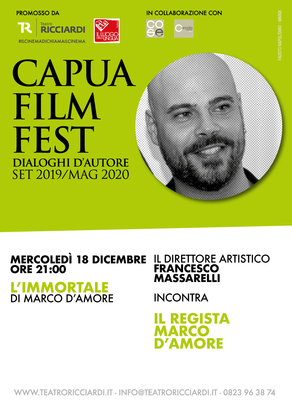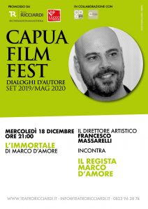 Capua– Per il quarto appuntamento, Capua film fest– dialoghi d’autore incontra Marco D’amore durante l’ultimo giorno dedicato alla proiezione del film “L’immortale”. Il format cinematografico diretto da Francesco Massarelli con la preziosa collaborazione del Teatro Ricciardi e “Capua il Luogo della lingua” attende il pubblico mercoledì 18 dicembre alle ore 21.00 per il film record d’incassi.