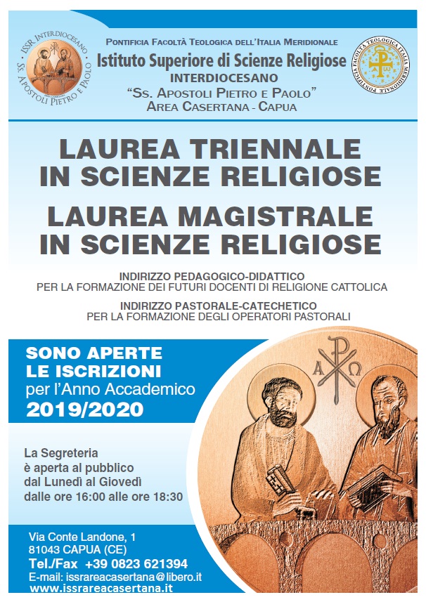 Con la seduta di Laurea di lunedì 8 luglio 2019 si è felicemente concluso il primo Anno Accademico dell’Istituto Superiore di Scienze Religiose Interdiocesano “Ss. Apostoli Pietro e Paolo” – Area Casertana (Pontificia Facoltà Teologica dell’Italia Meridionale), con sede in Capua. Ben tredici sono stati gli studenti che hanno conseguito la Laurea triennale in Scienze religiose, mentre sette laureati hanno definitivamente coronato con il titolo accademico magistrale il loro percorso di studi.