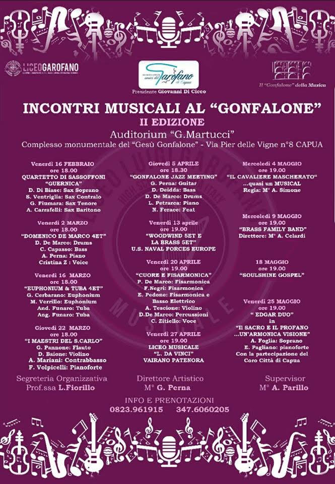 Aprirà i battenti questo pomeriggio “INCONTRI MUSICALI AL GONFALONE”, la rassegna giunta quest’anno alla seconda edizione e curata dall’associazione “Amici del Garofano”, che fa capo direttamente al prestigioso Liceo “Luigi Garofano” di Capua e che annovera tra i suoi iscritti docenti, genitori ed alunni, sia attuali che ex.