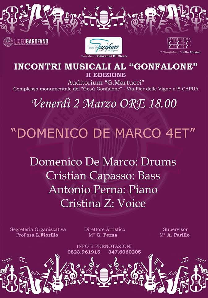 Nella suggestiva location offerta dall’auditorium “G. Martucci” del bellissimo complesso monumentale del Gesù Gonfalone, a partire dalle ore 18, è in programma il concerto della band “DOMENICO DE MARCO 4ET”, con Domenico De Marco alla batteria, Cristian Capasso al basso, Antonio Perna al piano e la voce di Cristina Z che allieteranno insieme i presenti e segneranno l’avvio della rassegna guidata dal direttore artistico Maestro Giancarlo Perna, con Supervisor il Maestro Antonio Parillo e segretaria organizzativa la docente Loredana Fiorillo.
