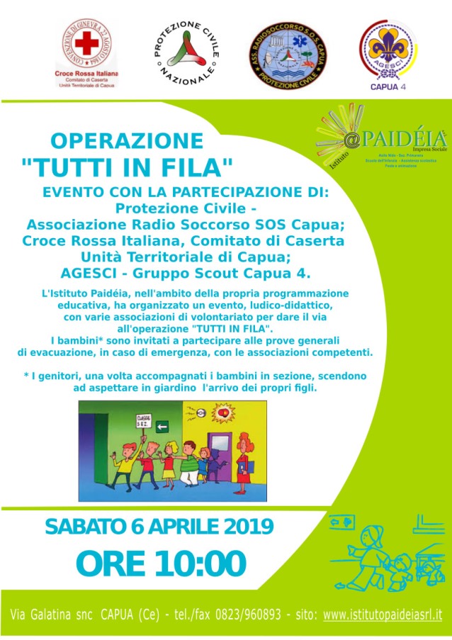 CAPUA – Sabato 6 aprile 2019, con inizio alle ore 10.00, si terrà presso l’Istituto Paritario Paideia in Sant’Angelo in Formis l’evento ludico-didattico “Operazione Tutti in Fila”. Nel grande parco attrezzato del Paideia, le attività sia ludiche sia didattiche saranno realizzate grazie alla Protezione Civile-Associazione Radio Soccorso SOS Capua, alla Croce Rossa Italiana – Comitato di Caserta – Unità Territoriale di Capua, all’AGESCI – Gruppo Scout Capua 4.
