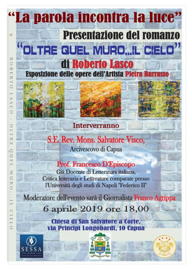 CAPUA – “La parola incontra la luce” è il titolo dell’incontro che si terrà sabato 6 aprile 2019, alle ore 18,00, nella Chiesa di San Salvatore a Corte, in via Principi Longobardi a Capua, nel corso del quale sarà presentato il romanzo di Roberto Lasco “Oltre quel muro… il Cielo”. A fare da cornice alla manifestazione, le opere dell’artista di fama internazionale Pietra Barrasso.