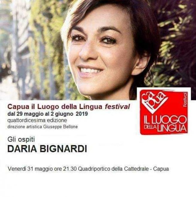 CAPUA – La giornalista, conduttrice televisiva, Daria Bignardi, sarà  a Capua per lo spettacolo teatral-musicale ‘La coscienza dell’ansia’, venerdì 31 maggio alle ore 21,30 al Quadriportico della Cattedrale nell’ambito della XIV edizione di ‘Capua il Luogo della Lingua Festival.