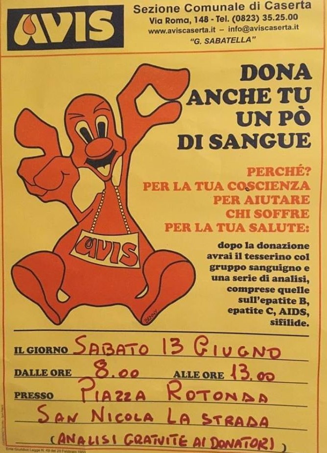 L’AVIS Comunale di Caserta ha istituito il Centro raccolta fisso di Caserta, in Via S. Josemaria Escrivà, 16/36. Il Centro è funzionante nei giorni di lunedì e venerdì mattina dalle ore 8:00 alle ore 12:00. Sabato 13 giugno 2020, nel Largo Rotonda di San Nicola la Strada, l’AVIS di Caserta ha organizzato una raccolta di sangue. Le operazioni, attraverso l’autoemoteca, inizieranno alle ore 8:00 e termineranno alle ore 13:00, sempre in completa sicurezza sia per il donatore/ce che per gli stessi operatori sanitari dell’AVIS. Dopo la donazione di sangue sarà consegnato il tesserino di donatore con il gruppo sanguigno e una serie di analisi GRATUITE, comprese quelle sull’Epatite “B”, Epatite “C”, AIDS, Sifilide