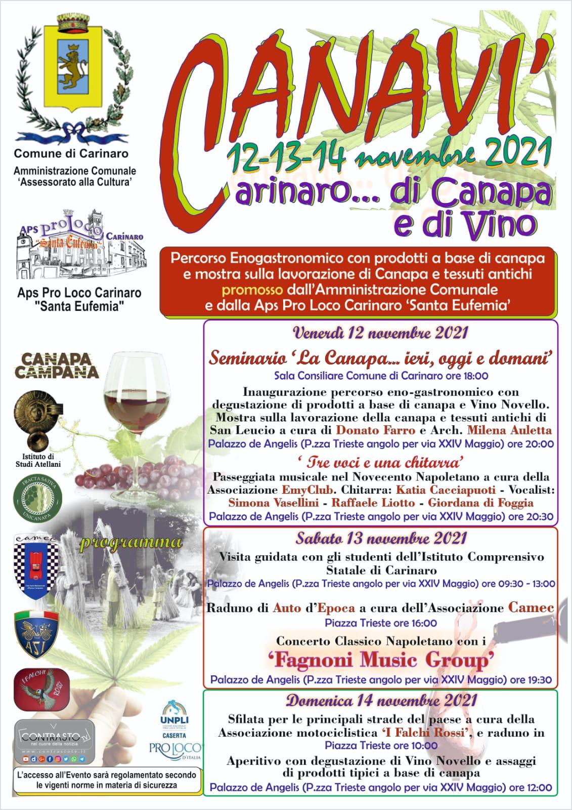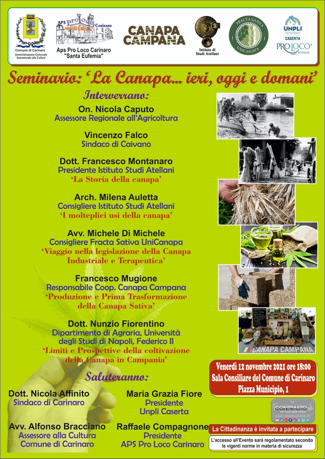 Presso il Comune di Carinaro parte, dal 13 novembre, una tre giorni a base di “canapa e vino”. L’evento è stato promosso dall’Aps Pro Loco Carinaro Sant’Eufemia e dall’assessore alla cultura Alfonso Bracciano. Ad inaugurare il percorso enogastronomico a base di canapa e vino novello sarà il seminario: “La Canapa …ieri, oggi e domani”.L’incontro avrà inizio presso la Sala Consiliare del Comune di Carinaro, alle ore 18.00 del 12 novembre. Ad intervenire nel corso del seminario saranno: l’On. Nicola Caputo, Assessore Regionale dell’Agricoltura; il sindaco di Caivano, Vincenzo Falco; il dottor Francesco Montanaro, Presidente dell’Istituto Studi Atellani, con la “Storia della Canapa”; l’architetto Milena Auletta, Consigliere dell’Istituto Studi Atellani, con i “Molteplici Usi della Canapa”; l’avvocato Michele de Michele, Consigliere Fracta Sativa UniCanapa, che interverrà a proposito del “ Viaggio nella Legislazione della Canapa Industriale e Terapeutica”; Francesco Mugione, responsabile Coop. Canapa Campana, con “ Produzione e Prima Trasformazione della Canapa Sativa”; il dottor Nunzio Fiorentino, Dipartimento di Agraria Università Federico II, con “ Limiti e Prospettive della Coltivazione della Canapa in Campania”. Oltre agli interventi, ci saranno i saluti del sindaco di Carinaro Nicola Affinito; dell’avvocato Alfonso Bracciano, assessore alla Cultura del Comune di Carinaro; di Maria Grazia Fiore, Presidente Unpli Caserta; Raffaele Compagnone, Presidente dell’Aps Pro Loco di Carinaro. Alle 20.00 si svolgerà, presso Palazzo de Angelis, una degustazione di prodotti a base di canapa e vino novello è una mostra di tessuti antichi di San Leucio, a cura di Donato Farro e dell’arch. Milena Auletta. Per le 20. 30 è previsto, sempre a palazzo De Angelis, uno spettacolo musicale dal titolo: “Tre voci e una chitarra”, che ripercorrerà le tappe del Novecento Napoletano, interpretato dalle voci di Simona Vasellini, Raffaele Liotto e di Giordana di Foggia, con Katia Cacciapuoti alla chitarra. Per sabato 13 novembre, invece, è in programma una visita guidata con gli studenti dell’Istituto Comprensivo Statale di Carinaro. Alle 16.00, in piazza Trieste e Trento, ci sarà un momento dedicato ad un raduno di auto d’epoca a cura dell’associazione Camec. La serata si concluderà con un concerto di Fagnoni Group che avrà inizio alle 19.30 a palazzo De Angelis. La manifestazione si concluderà, domenica 14 novembre, con una sfilata, intorno alle 10.00, per le principali strade del Comune, curata dall’associazione motociclistica “I Falchi Rossi” e con un raduno a piazza Trieste e Trento. A seguire un aperitivo, alle 12,00 a palazzo De Angelis a base di prodotti derivanti dalla Canapa e Vino Novello.