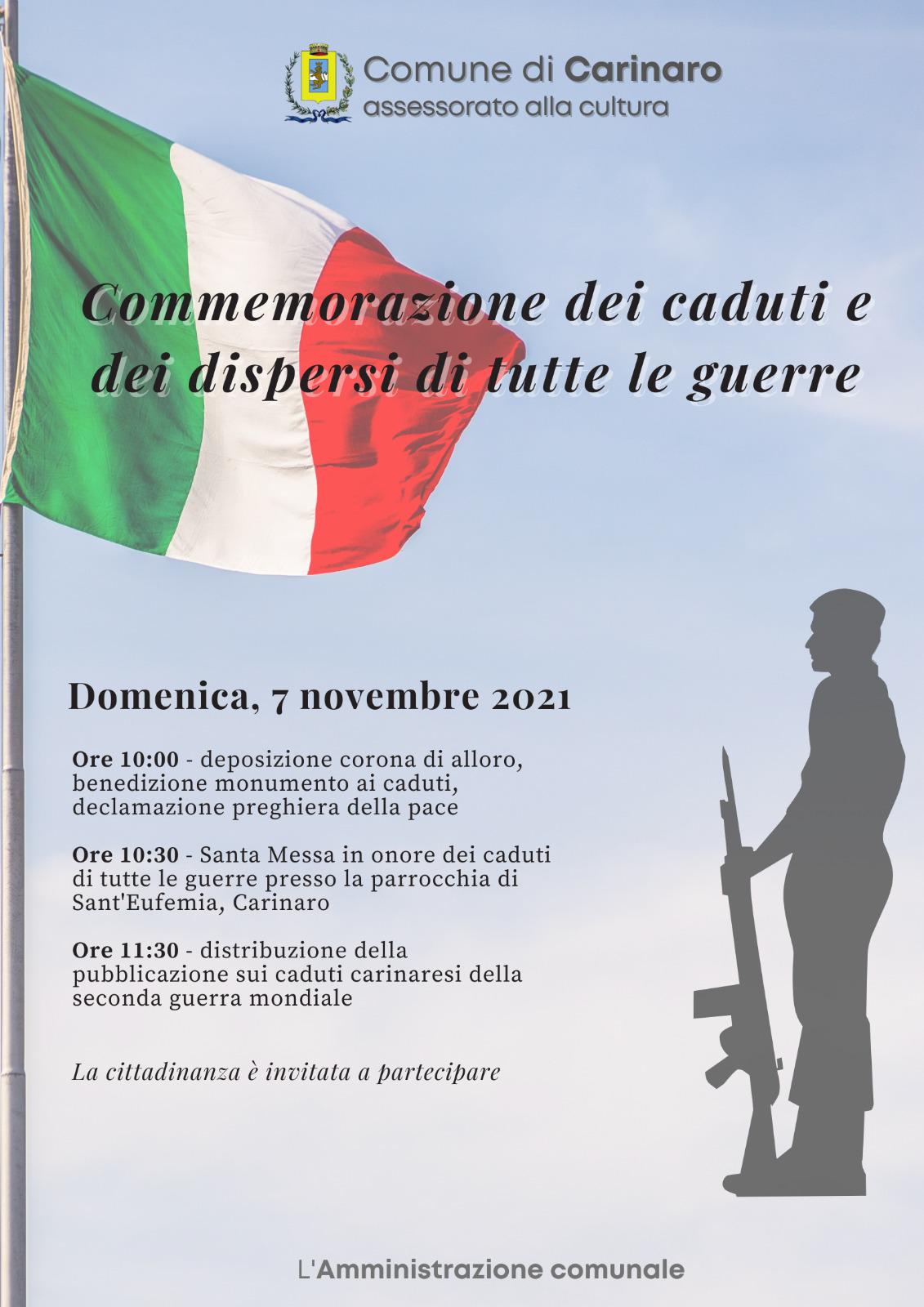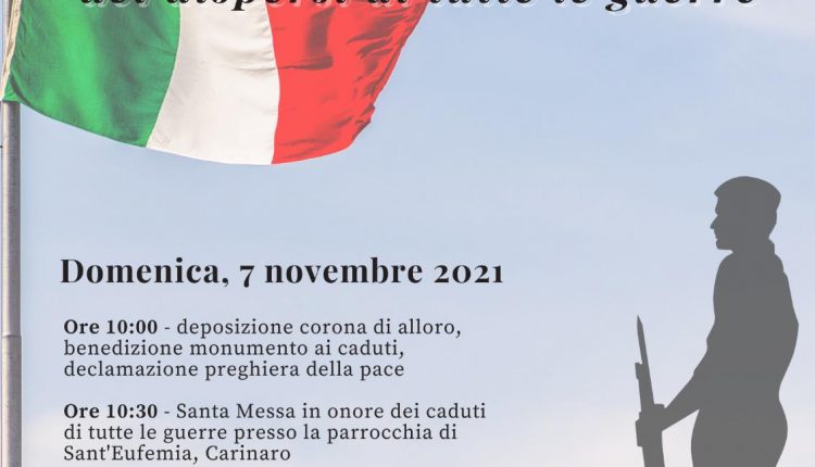 Carinaro,Si terranno domenica 7 novembre 2021 le celebrazioni per la commemorazione dei caduti e dei dispersi di tutte le guerre. Il programma curato dall’Amministrazione comunale e dall’ associazione culturale interforze di Carinaro prevede: