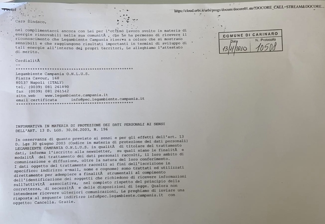 “Siamo lieti ed orgogliosi di condividere con voi la notizia che la nostra Carinaro ha ricevuto da Legambiente Campania il premio Comuni Rinnovabili 2020.